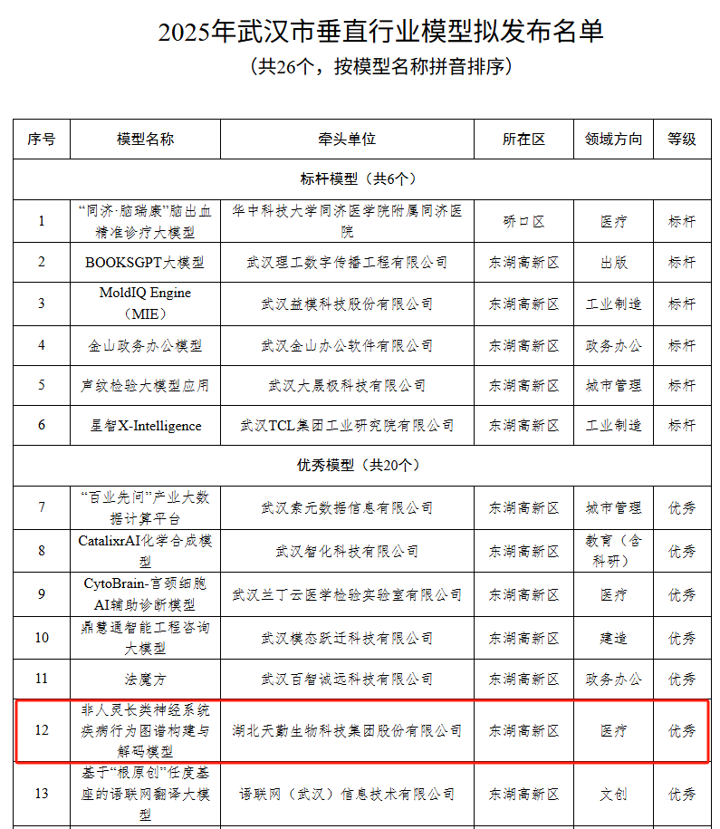 - 天勤生物行为图谱解码模型入选2025武汉市优秀垂直模型